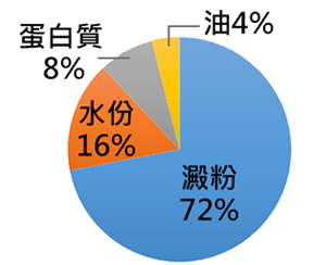 玉米成份組成:澱粉72%,水份16%,蛋白質8%,油脂4%